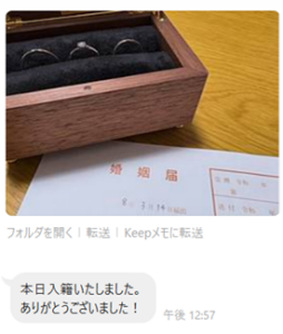 30代女性会員から3/14(土)「本日、入籍しました」とメッセージと写真が届きました。